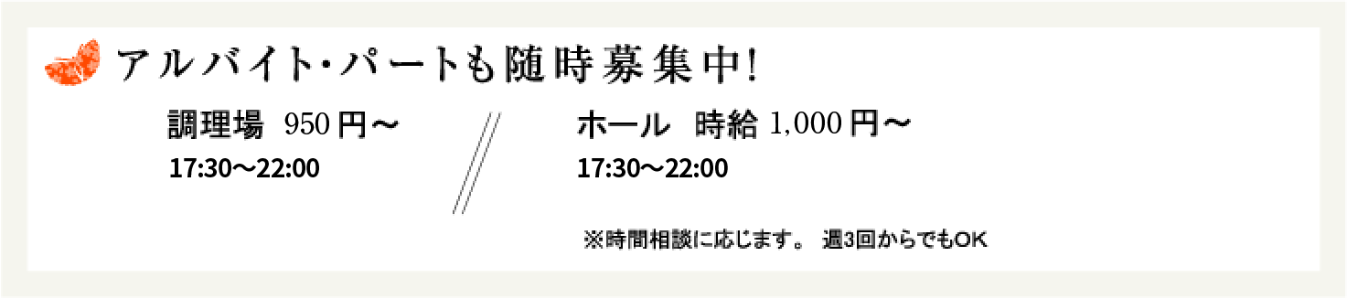 お客様に喜んでいただくことを、自分自身の原動力に飲食店の一番の使命は、お客様に心地よい時間を提供し、喜んでいただくこと。お客様が何を求めているか、その立場にたって行動できる方なら経験は問いません。とはいえ、最初は失敗もクレームも当たり前の世界。笑顔を忘れず、前向きに頑張れる方なら、その成果が必ず表れる職場です。